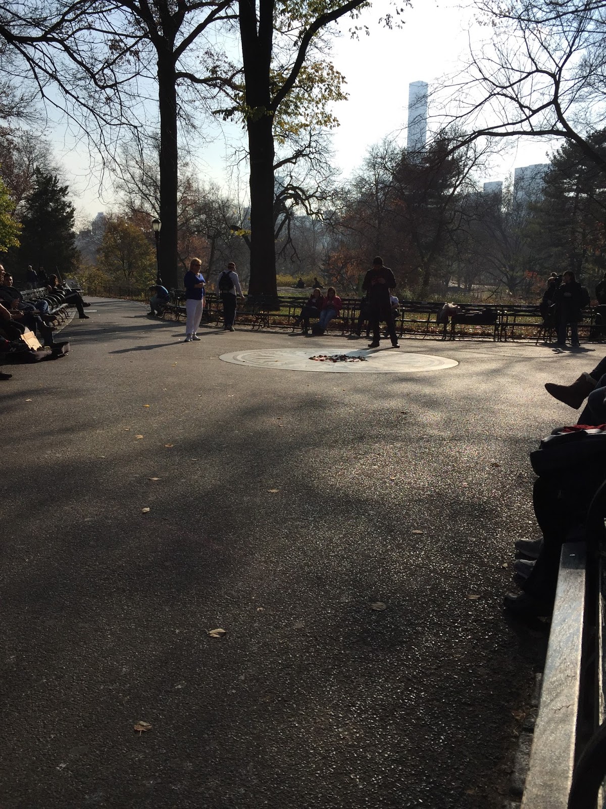 After a rather painful morning (one of us had a bit of a headache) and a long hike up to the The North Face store (someone, I won't say who but it wasn't me, lost their jacket), we stopped in Central Park by Strawberry Fields. I like this little piece of the park. There was a guy there playing guitar and singing Beatles songs.